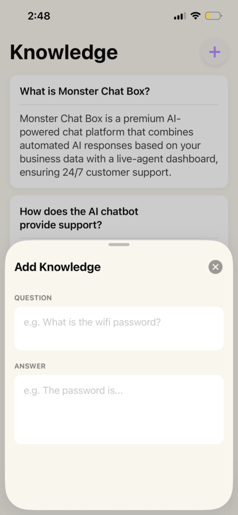 View live conversations, review AI responses, jump in when needed, and manage your chatbot’s knowledge — all directly from your iPhone. No laptop required.